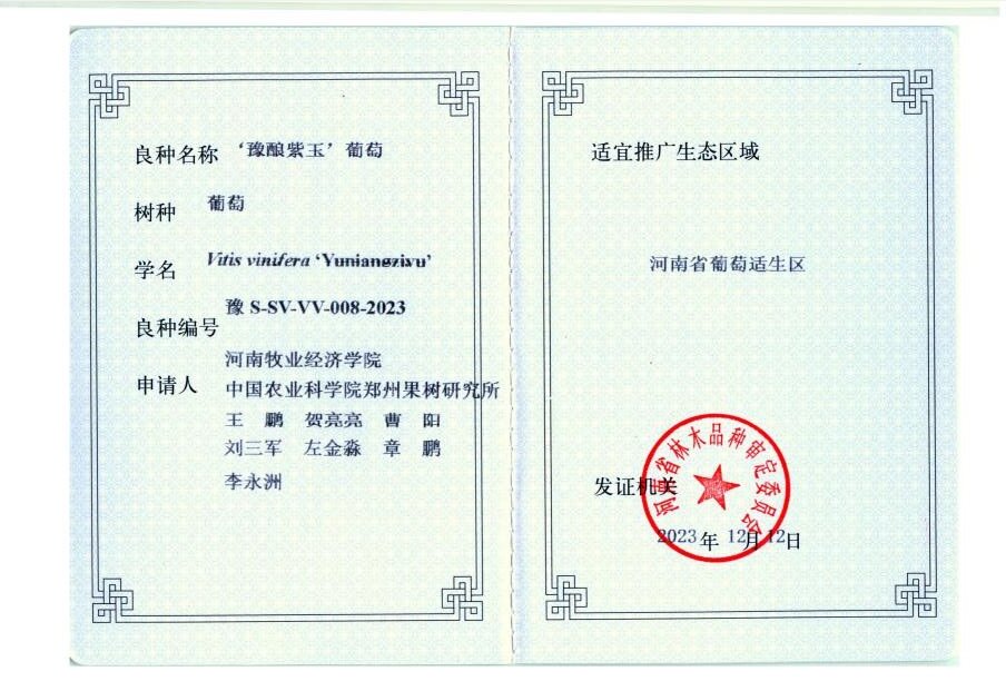 由我校为第一完成单位、我校教师王鹏老师主持选育的酿酒葡萄新品种‘豫酿紫玉’,通过线上av省林木品种审定委员会审定,获线上av省林木良种,在线上av省葡萄适生区及与其相似其他葡萄适生区进行推广。