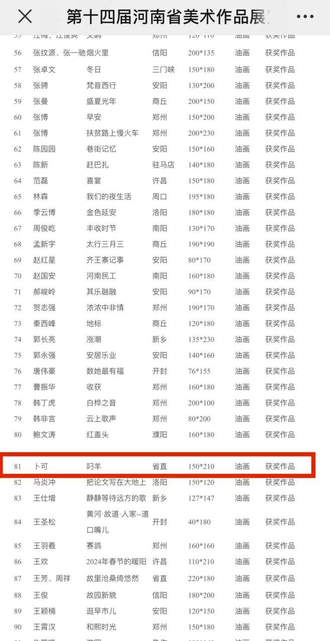 卜可常年致力于油画创作研究,其作品有着独特的风格与特点,曾多次在各级各类绘画评选中获奖。在全省的众多参赛作品中,他的作品能够入选省美展,荣获奖项,是对其深厚艺术底蕴和精湛创作能力的极高赞誉。