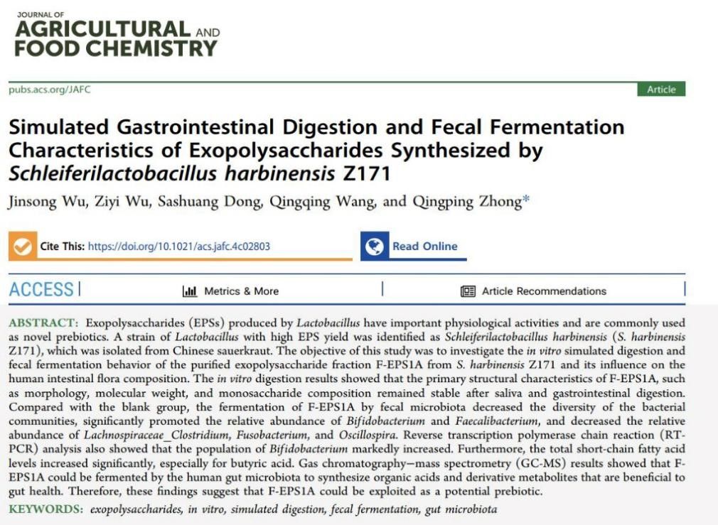 日前,理学部吴金松博士在中科院一区Top期刊《Journal of Agricultural and Food Chemistry》(影响因子5.7)发表了题为“Simulated gastrointestinal digestion and fecal fermentation characteristics of exopolysaccharide synthetized by Schleiferilactobacillus harbinensis Z171” 的研究论文,该论文成果我校为第一署名单位,吴金松博士为第一作者,华南农业大学钟青萍教授为通讯作者,并且得到了国家自然科学基金和广东省基础与应用基础研究基金等项目的资助。