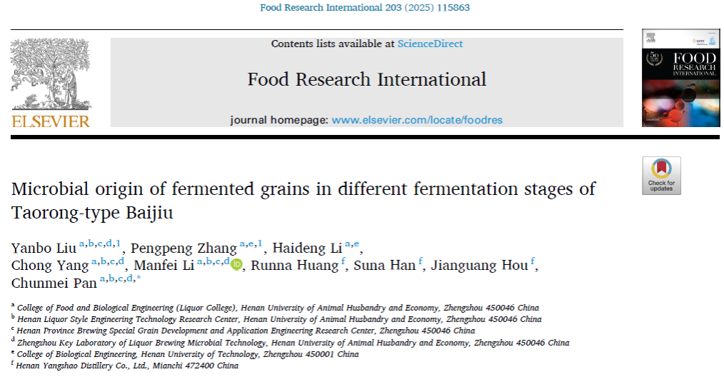 近日,我校酿酒团队师生在国际知名学术期刊《Food Research International》(中科院1区TOP期刊,IF:7)上发表了题为“Microbial origin of fermented grains in different fermentation stages of Taorong-type Baijiu”的研究型学术论文。食品与生物工程学院副教授刘延波和联合培养的硕士研究生张朋朋为共同第一作者,潘春梅教授为通讯作者,我校为第一署名单位和通讯单位。该研究得到了线上av省重点研发专项(线上av白酒生态酿造关键技术研发与示范应用)和食品科学与工程校级重点学科项目资助支持。