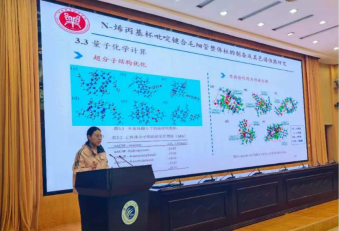 郭云以《N-烯丙基杯吡啶键合毛细管整体柱的制备及其色谱性能研究》为题,系统介绍了以N-烯丙基杯吡啶为功能单体,构建新型毛细管整体柱的制备路线、表面形貌调控机制及其在复杂生物样品分离中的优异表现。该研究首次将杯吡啶大环的分子识别特性与烯丙基超交联网络的高稳定性相结合,实现了对双酚类、杂环胺类、生物胺类等九类化合物的高效、快速分离。