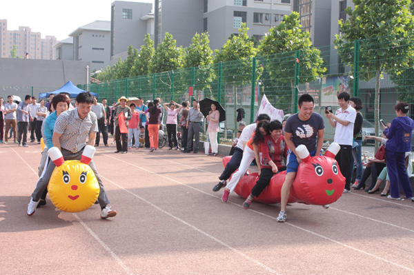 运动场上,各项比赛紧张有序地进行。参赛队员活力四射,旁边站满了呐喊助威的观众。“加油!加油!”,呐喊声此起彼伏,现场十分热闹。在运转乾坤项目中,老师们迈着矫健的步伐,并肩前行,争取用最少的时间夺取胜利。旁边,协力竞走项目正紧张地进行着,老师们四人一队,相互配合,步调一致,伴随着“左、右,左、右……”的口号奋力向前。毛毛虫项目,早已人头涌动,参赛选手卯足了劲往前冲。三人四足项目二个代表队齐头并进,队员默契配合,势均力敌。尤其是“绕月接力”项目把全场气氛推向高潮。这个项目是院工会首创,老师们分成两队,每队各派八人,五男三女,追逐绕圆接力,时间短者为胜。比赛一开始,参赛选手精神抖擞,双方你追我赶,现场气氛高涨。活动现场,一位李姓老师表示:“参加趣味运动会,我感到十分高兴,平常工作紧张忙碌,运动会不仅能让老师们借机会聚一聚,缓解一下压力,还可以培养团队精神。”