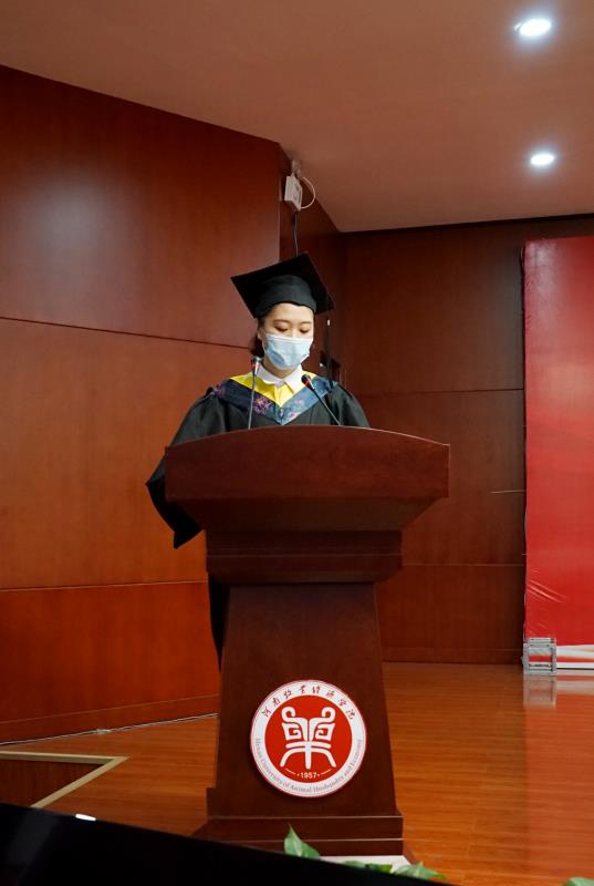 包装与印刷工程学院2016级包装工程2班罗莹莹同学作为毕业生代表发言。她表示将坚定信念、不忘初心、砥砺前行,成为社会中最积极向上的精神力量,并希望母校明天更加辉煌。