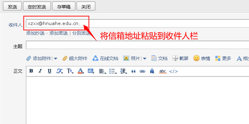 2、如果不能直接发送,可以使用个人邮箱,将上面的邮箱地址粘贴到收件人栏,给校领导发送邮件。